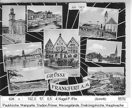 Paulskirche, Mainpartie, Stadion, Römer, Messegelände, Dreikönigskirche, Hauptwache (Schrift)