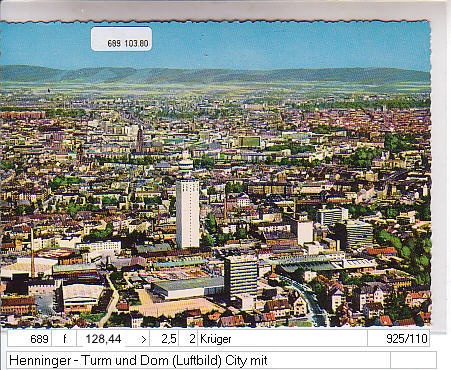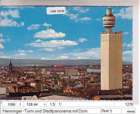 Henninger -Turm und Stadtpanorama mit Dom (Text !)