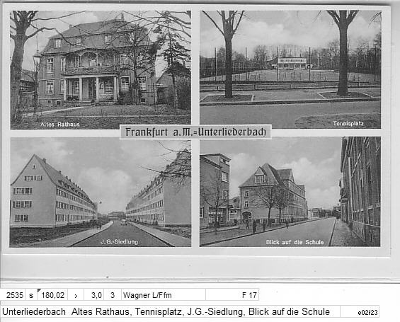 Unterliederbach Altes Rathaus, Tennisplatz, J.G.-Siedlung, Blick auf die Schule