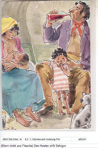 (Mann trinkt aus Flasche) Den Husten stillt Selvigon