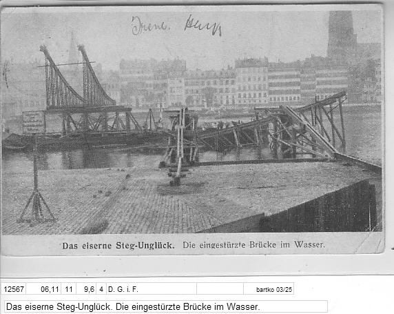 Das eiserne Steg-Unglück. Die eingestürzte Brücke im Wasser.