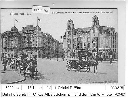Bahnhofsplatz mit Cirkus Albert Schumann und dem Carlton-Hotel D
