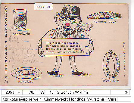Karikatur (Aeppelwein; Kümmelweck; Handkäs; Würstche + Vers