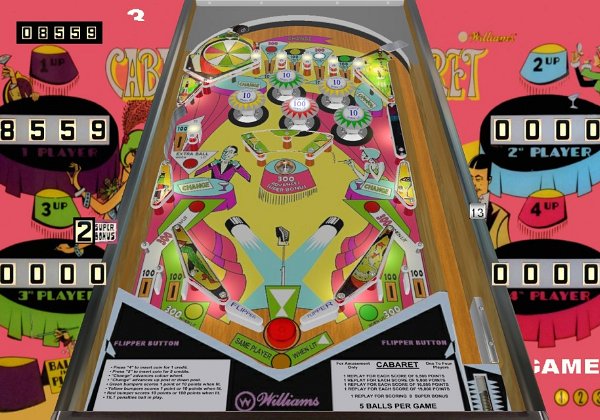 Cabaret (Williams) 1968 / VP10 - balls: 5 / graphic: 2 / lost: 5 / game: 2 / layout: 6 / fun: 2- score VP 8: 8.107- score VP10: 8.559Caddie (Plamatic) 1975 / VP10 - balls: 5 / graphic: 1 / lost: 6 / game: 5 / layout: 5 / fun: 4 - score VP 9: 8.034 / fast killer - score VP10:  xxCamelot (Bally) 1970 / VP8 - balls: 3 / graphic: 3 / lost: 4 / game: 2 / layout: 6 / fun: 4- score VP 8: 6.449Campus Queen (Bally) 1966 / VP8 - balls: 5 / graphic: 4 / lost: 5 / game: 5 / layout: 6 / fun: 3- score VP 8: 4.471Canada Dry (Gottlieb) = Eldorado 1976 / VP10 - balls: 5 / graphic: 4 / lost: 6 / game: 5 / layout: 6 / fun: 5 - score VP10: 97.160 / impossible / = Target Alpha = Solar City = El Dorado = Lucky Strike -…Canasta 86 (Inder) 1986 / VP8 / also in VPM +- balls: 5 / graphic: 5 / lost: 6 / game: 4 / layout: 6 / fun: 6 - score VP 8: 725.710 - score FP : 1.880.120 / version in Future PinballCan Can (Williams) 1955 / VP10 - balls: 5 / graphic: 6 / lost: 2 / game: 4 / layout: 6 / fun: 5- score VP 9: 9.800.000- score VP10: .Capersville (Bally) 1966 / VP10 - balls: 5 / graphic: 2 / lost: 6 / game: 5 / layout: 6 / fun: 6- score VP 9: 3.746- score VP10: 5.727Captain Card (Gottlieb) = Top Hand 1973 / VP10 - balls: 5 / graphic: 3 / lost: 5 / game: 5 / layout: 5 / fun: 5- score VP10: 136.000 / add-a-ball; = High Hand = Top Hand (add-a-ball)Captain Fantastic (Bally) 1975 / VP10 / or FP- balls: 3 / graphic: 1 / lost: 5 / game: 1 / layout: 6 / fun: 5 - score VP 8: 126.590 / 5 balls - score VP 9: 91.480 / 3 balls - score VP10: 127.710 / 3 balls…Captain Hook (Game Plan) 1985 / VP8 / or VPM- balls: 3 / graphic: 4 / lost: 3 / game: 3 / layout: 5 / fun: 4- score VP 8: 930.940Captain Kidd (Gottlieb) 1960 / VP8 - balls: 5 / graphic: 2 / lost: 6 / game: 2 / layout: 6 / fun: 1- score VP 8: 1.525 B ... VP-recreationsD ... VP recreations