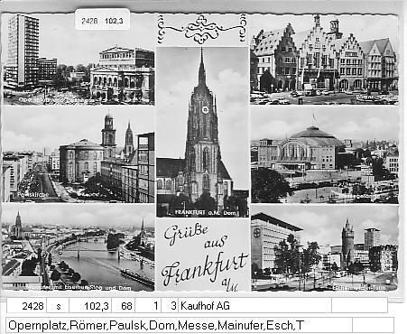 Paulskirche, Mainpartie, Stadion, Römer, Messegelände, Dreikönigskirche, Hauptwache (Schrift)
