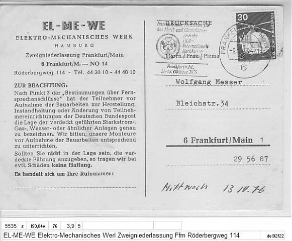 EL-ME-WE Elektro-Mechanisches Werl Zweigniederlassung Ffm Röderbergweg 114
