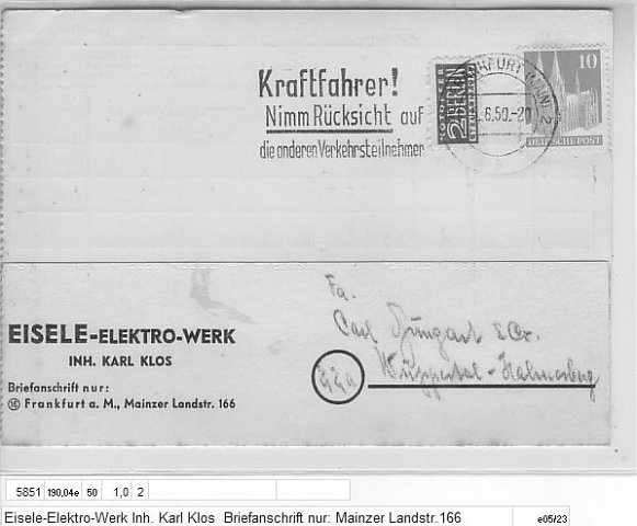 Eisele-Elektro-Werk Inh. Karl Klos Briefanschrift nur: Mainzer Landstr.166